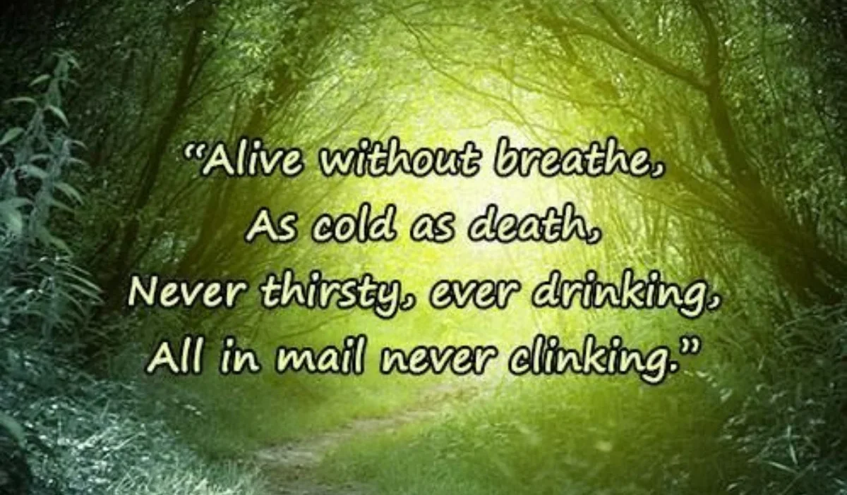 Answer: Darkness - Alive without breath, as cold as death; never thirsty, ever drinking, all in mail never clinking. 🐟